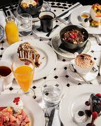 Think eggs Benedict with truffle hollandaise, champagne flights, and polished brunch plates.
