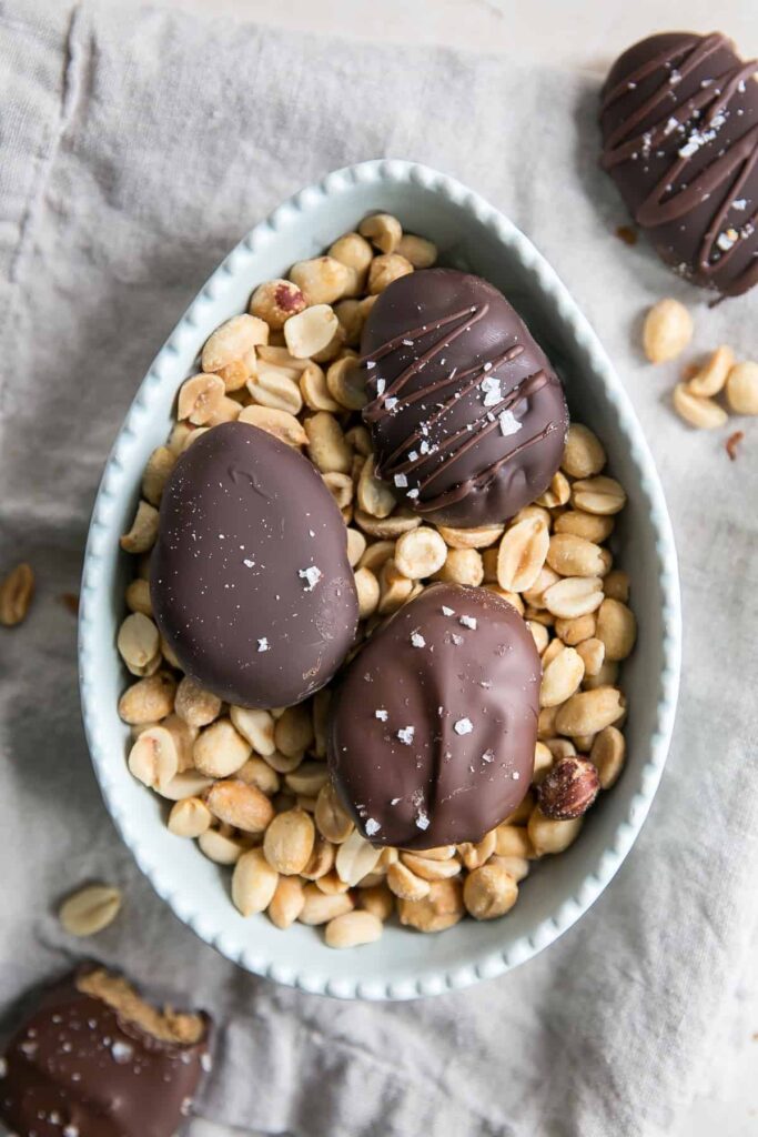 Expel chilled shelled nut butter eggs from the cooler. Utilizing a fork or diving instrument, lower each egg into the melted chocolate, ensuring full coverage. Delicately tap off the abundance of chocolate sometime,, then put the coated egg back on the material paper.