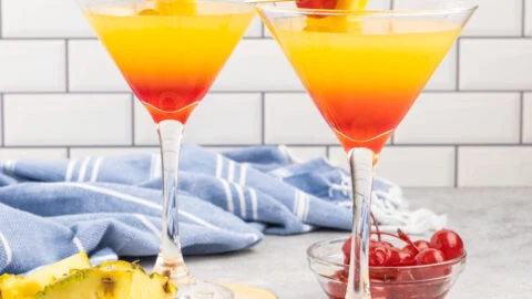 The pineapple upside-down cake drink is a dessert-inspired cocktail that mirrors the flavors of the conventional cake. Fair like the cake is layered with pineapple and cherry at the bottom, and the cake layer poured on best, this drink highlights layered flavors and colors: