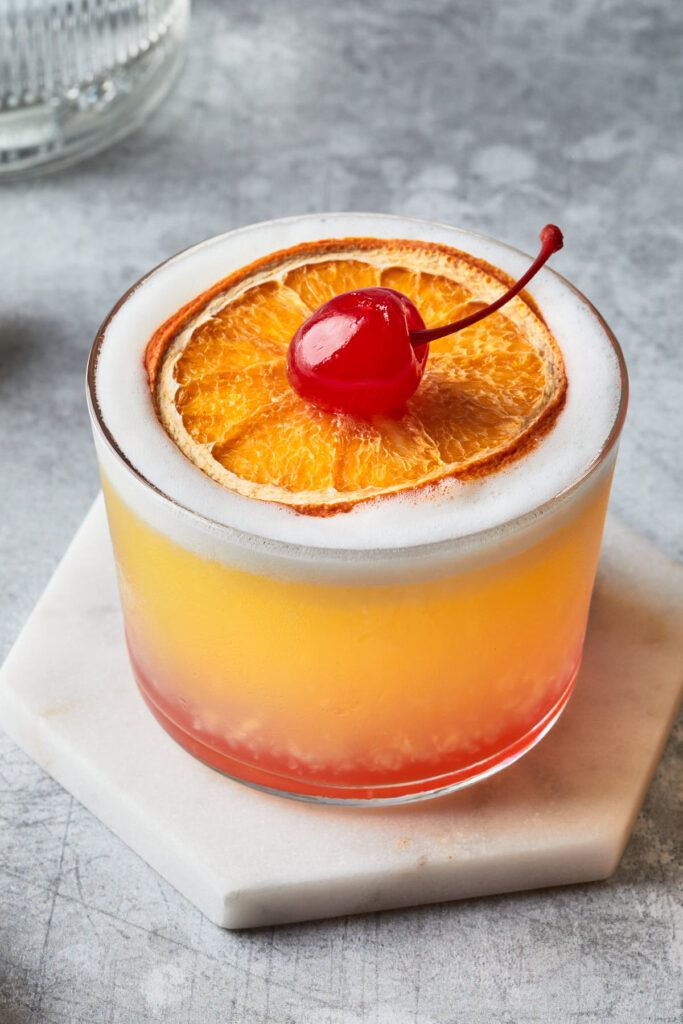 The pineapple upside-down drink captures the dessert’s sweet pineapple flavor, the wealth of vanilla or cake-like recommendations (depending on your choice of spirits), and the striking visual of shining rosy cherry juice sinking to the foot of the glass—mimicking the “upside down” impact.